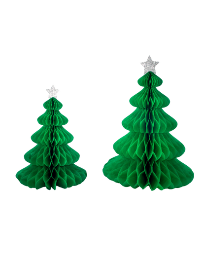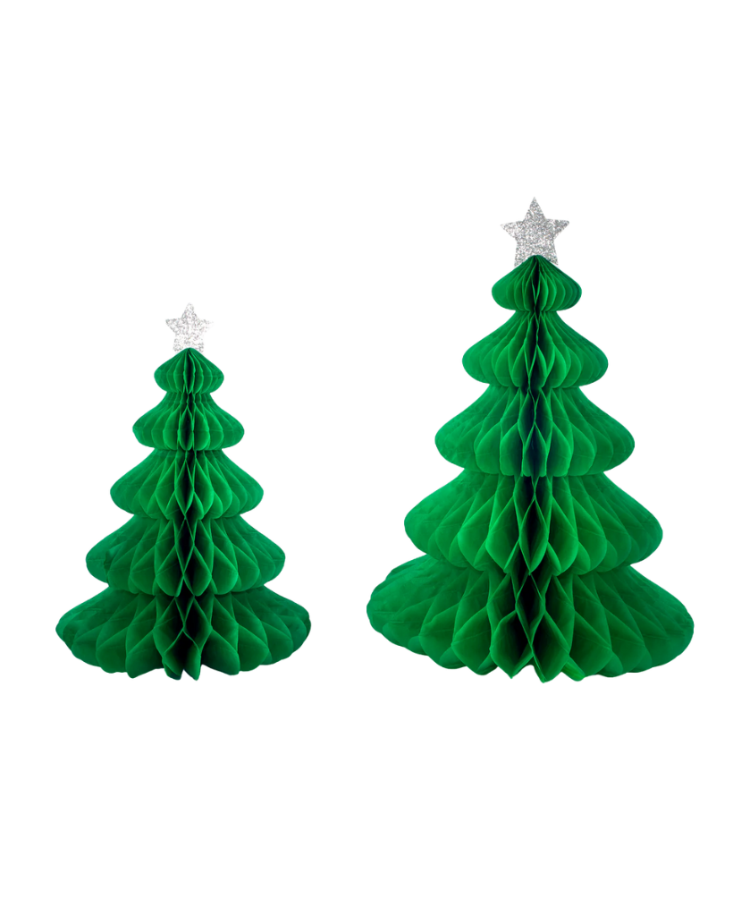 These Christmas trees are crafted from dark green tissue paper honeycomb, topped with a glittery silver star, for a fabulous 3D effect.