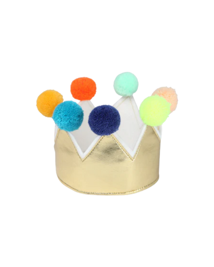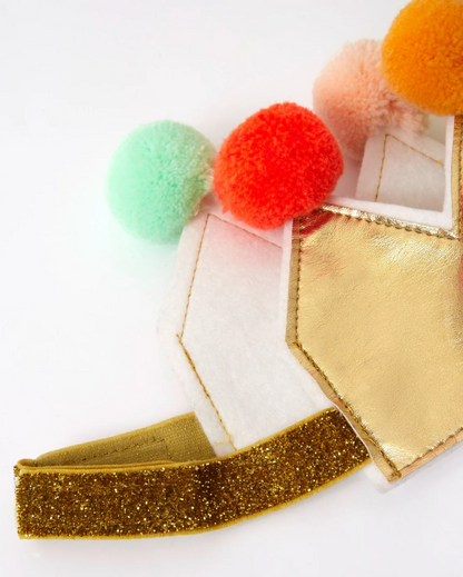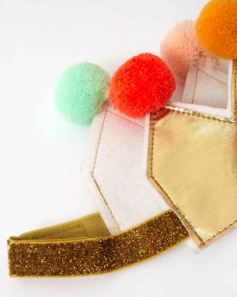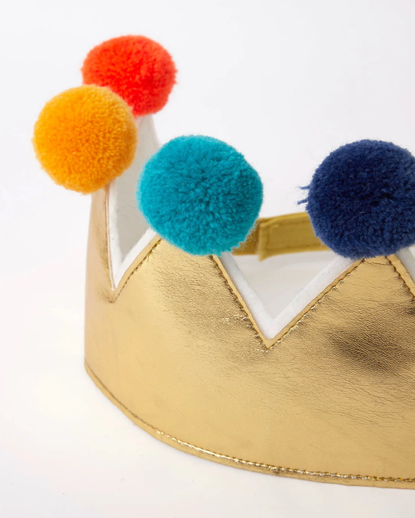 Meri Meri's shiny gold crown is made with gold leatherette and felt, topped with 7 bright coloured pompoms and finished with gold thread and glittery gold elastic with a hook and loop tape fastener.
