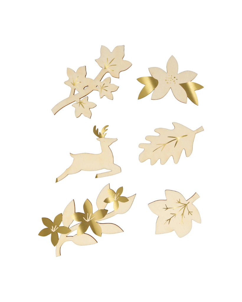 Each cracker contains a joke, gold paper hat and a wooden brooch with gold foil detail.