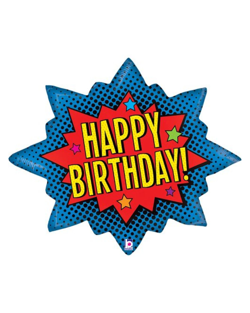 This large comic style super hero happy birthday foil balloon is 74cm, printed both sides, supplied flat. Can be filled with air or helium.