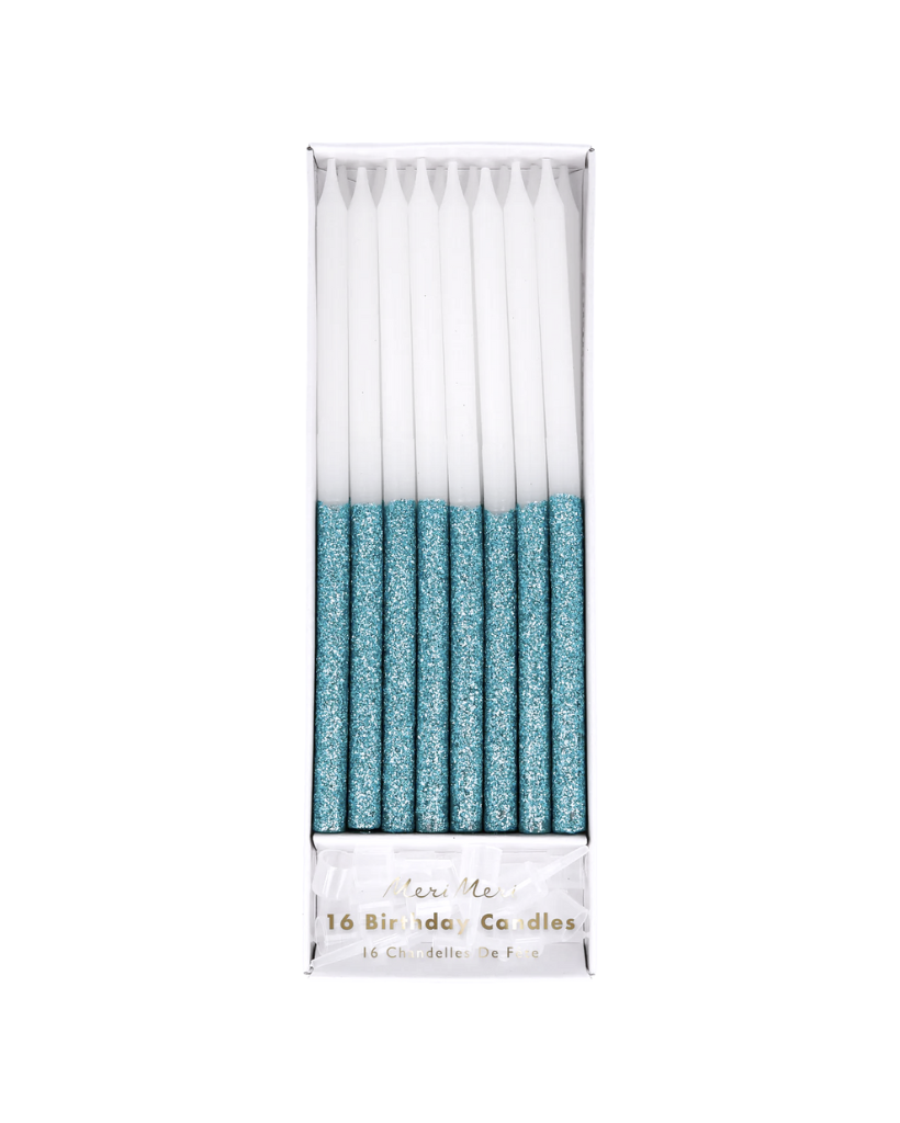 Set of 16 white candles, dipped in gorgeous pastel blue glitter from Meri Meri.