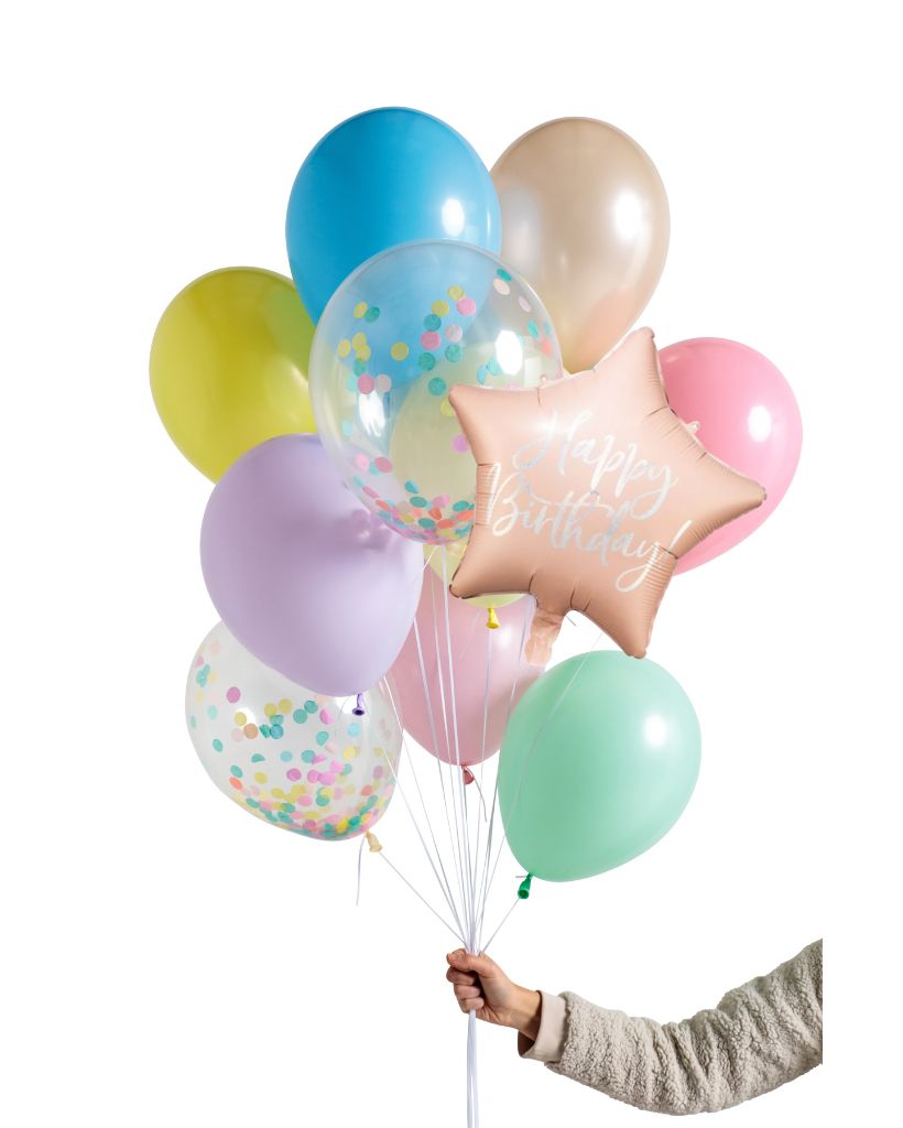 Inflated balloon set includes 10 solid colour 30cm balloons of the highest quality latex in shades of the pastel rainbow, 2 confetti-filled balloons and a fun pale pink happy birthday star foil balloon for that extra bit of birthday love! Balloon colours may vary but will remain awesome.