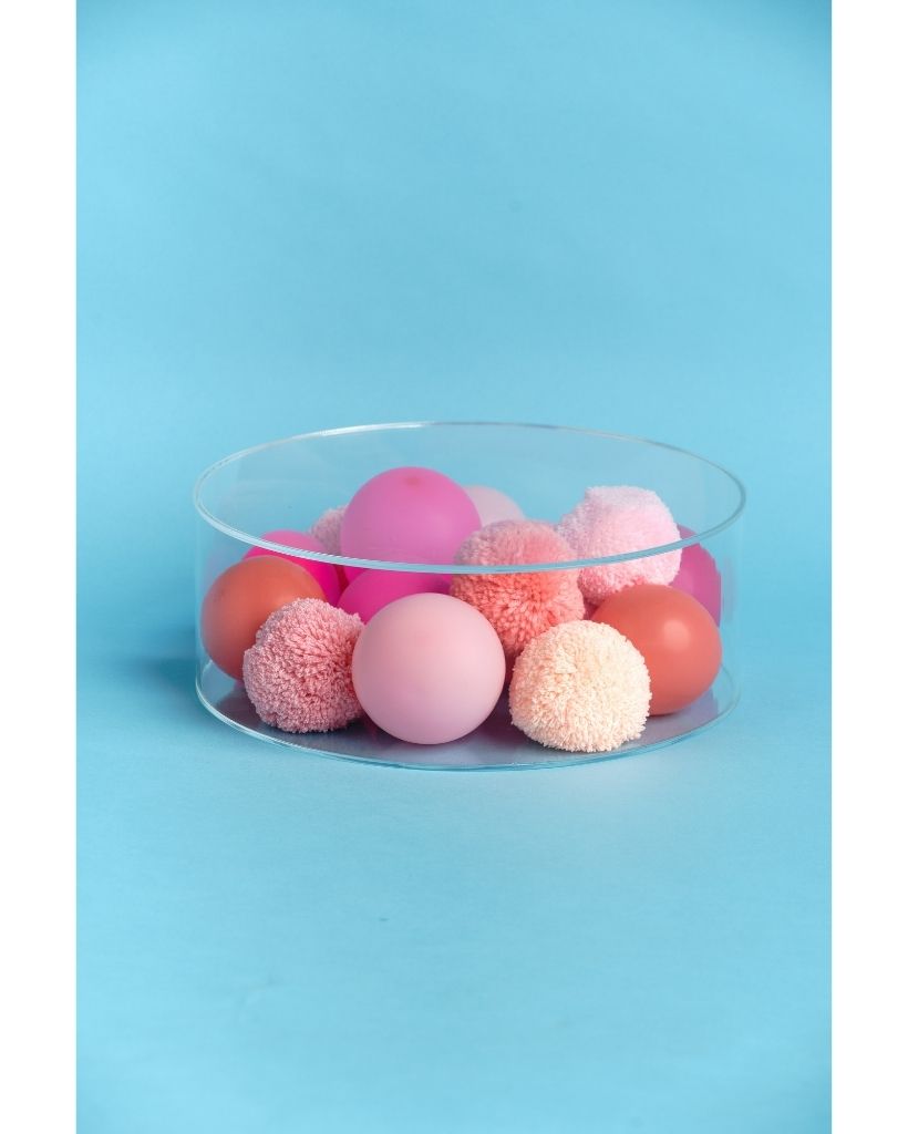 Simply inflate your balloons (to the same size as the poms) and tumble it all in to the cake stand together. Add some confetti for that little bit of extra flair.