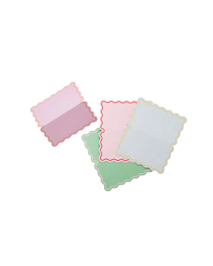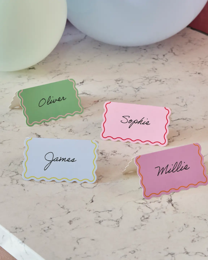 Pack of 8 fun multicoloured place cards in bright and pastel colours with contrasting wavy borders.